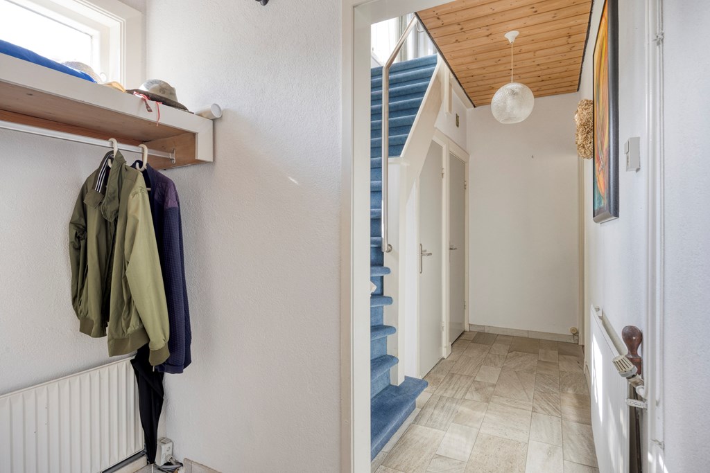 A driveway that accommodates several cars and a neatly landscaped front garden create an inviting first impression. Through the entrance you enter the hall, which provides access to the toilet, the staircase to the first floor, the cellar, and the living room. There is also ample space for a coat rack or storage unit.