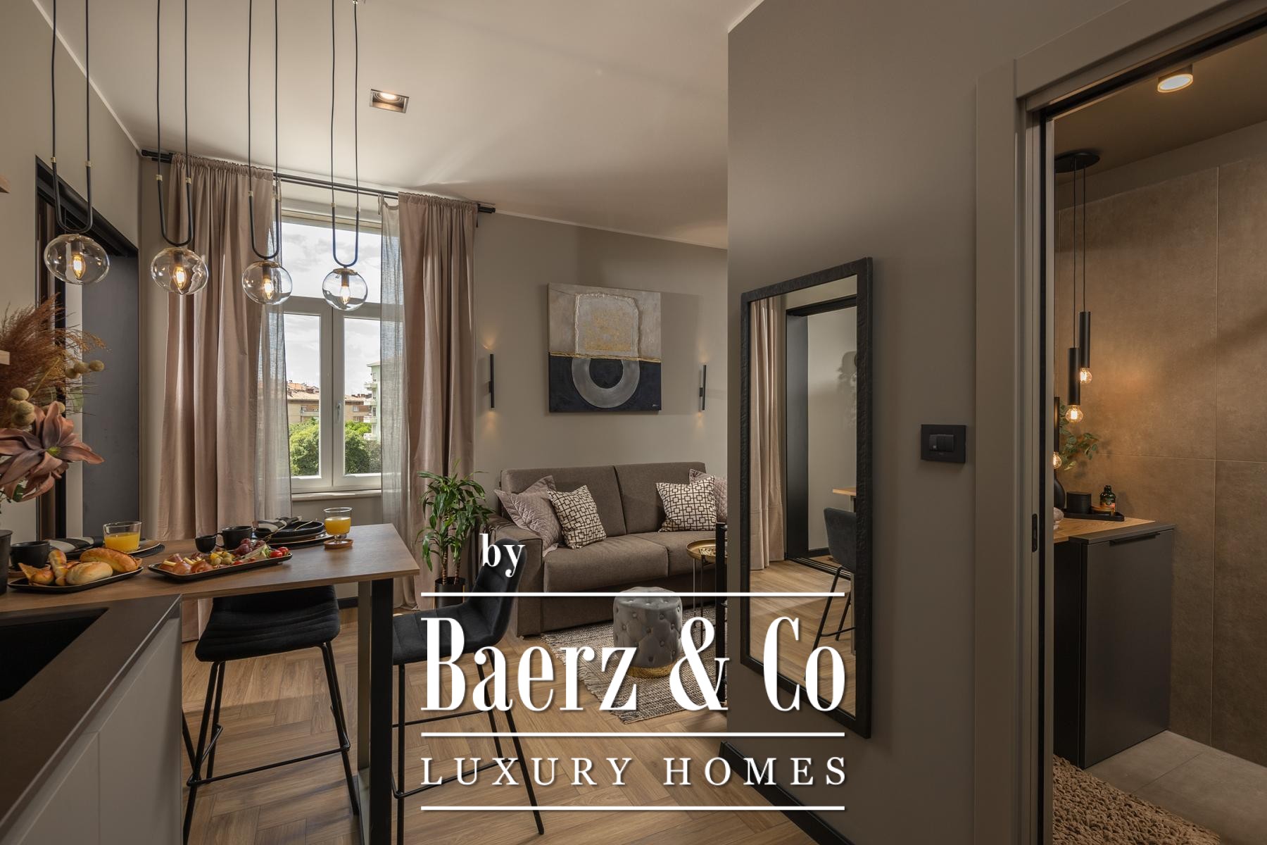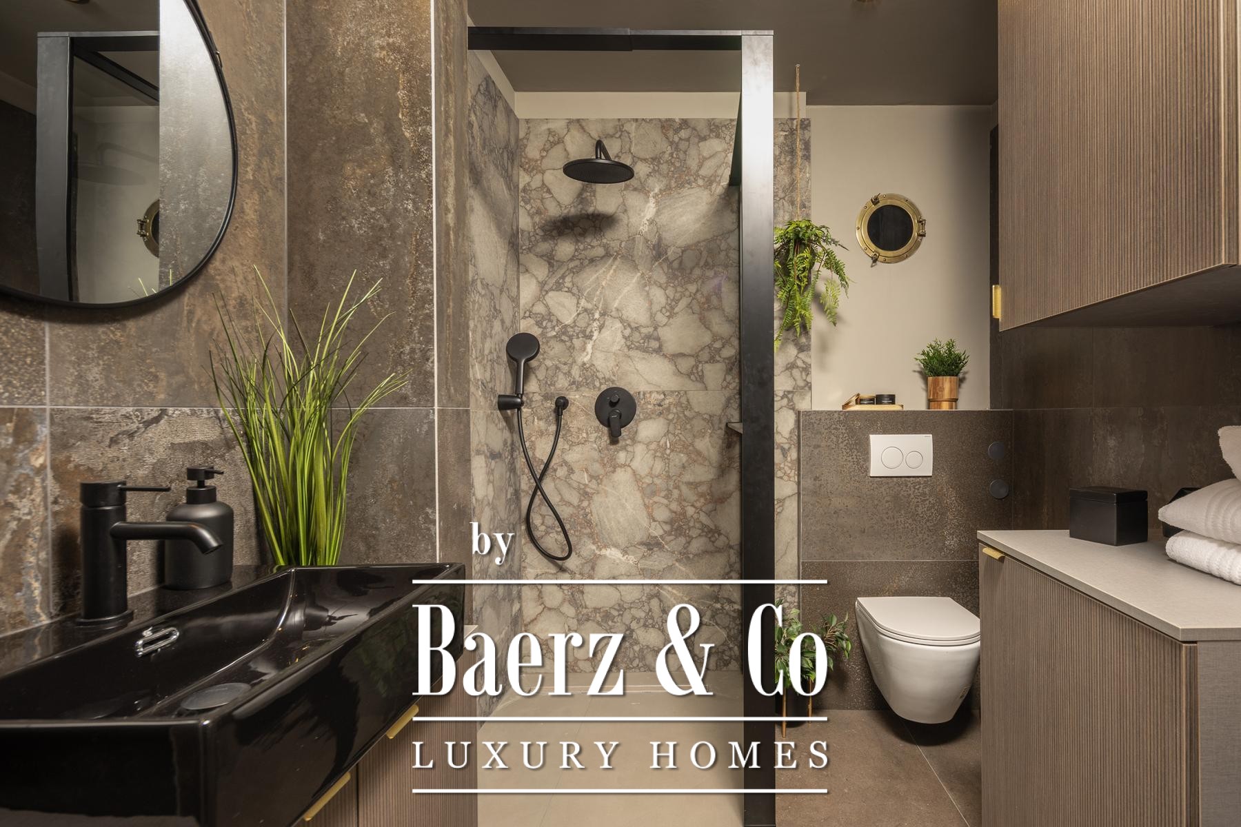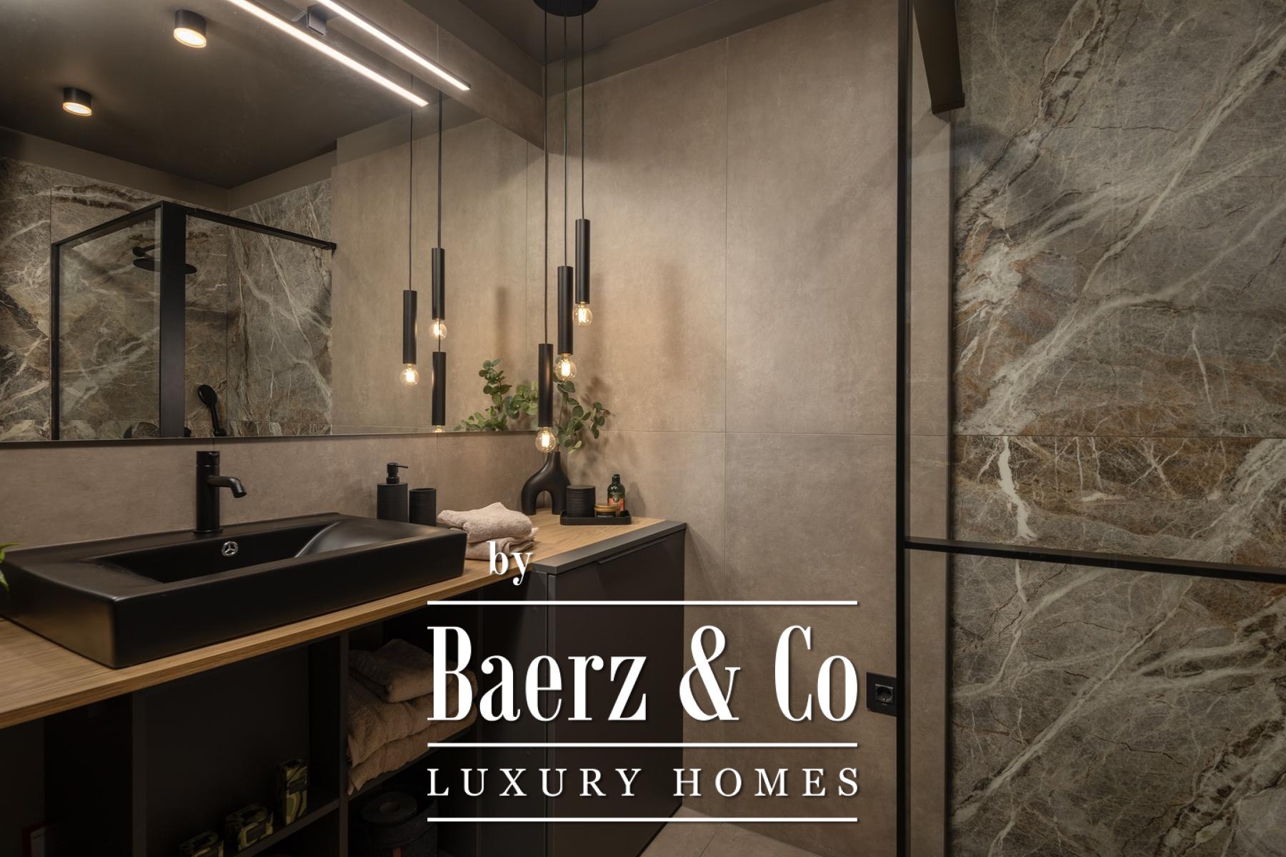 The interiors are shaped by a refined use of warm beige and anthracite, highlighted by gold details and custom lighting. Italian furnishings, large-format porcelain tiles, and matte black Veneta Cucine kitchens with sophisticated stone-marble backsplashes set an elevated tone. Frosted glass partitions, wooden wall slats with LED accents, and designer brass lighting complete the ambience.