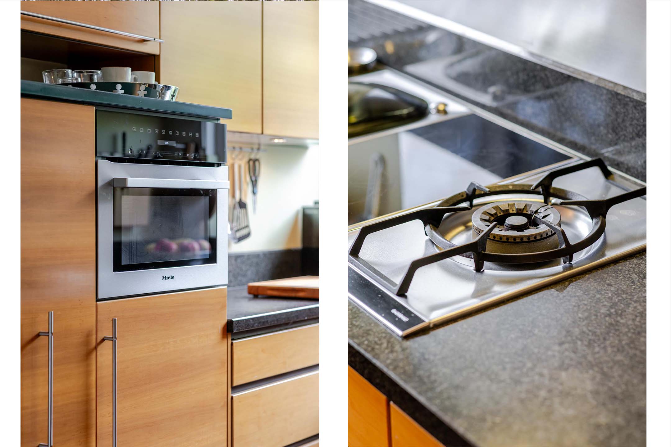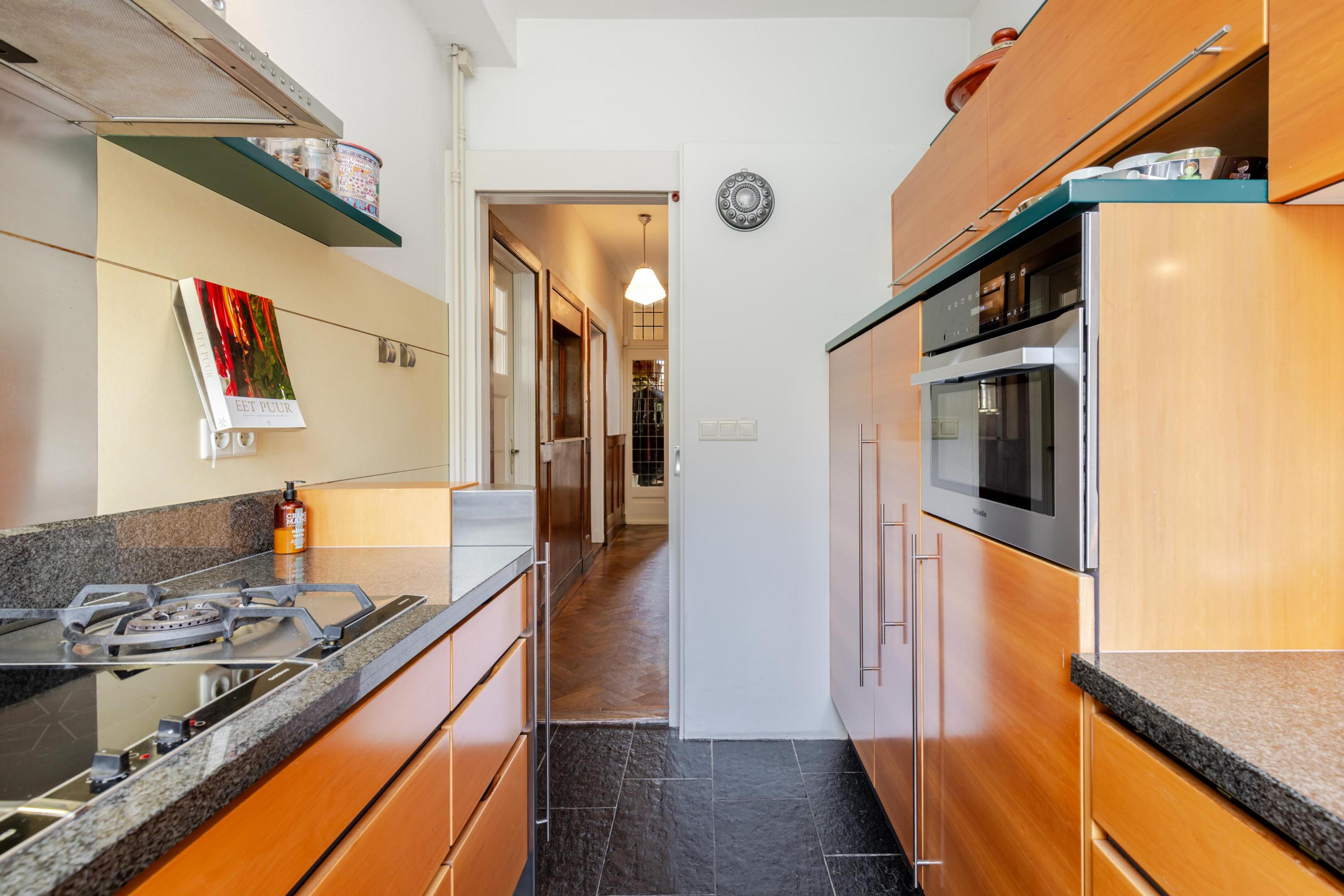 Entrance, vestibule with wardrobe, hall with staircase and toilet with washbasin, enclosed kitchen featuring a U-shaped layout making it very efficient and offering ample worktop and cupboard space, living room en suite featuring the original en suite sliding doors and built-in cupboards, herringbone parquet flooring, a romantic gas fireplace mantel (recently no longer usable due to gas-free living, but a wood stove could potentially be installed) and French doors to the veranda, which in turn provides access to the back garden.