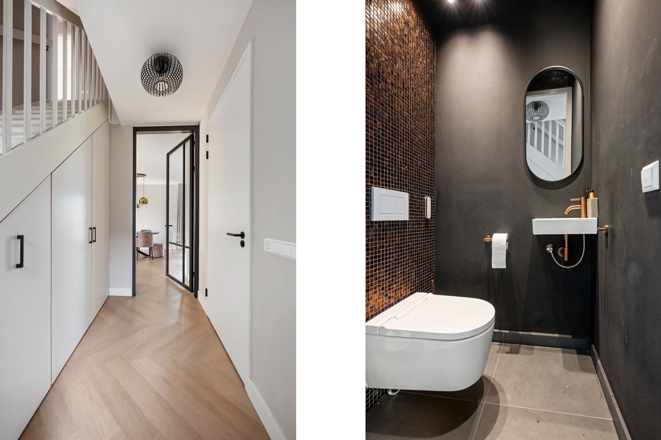 The inviting entrance hall features the meter cupboard, a toilet, stairs to the first floor, and access to both the bedroom and living room.