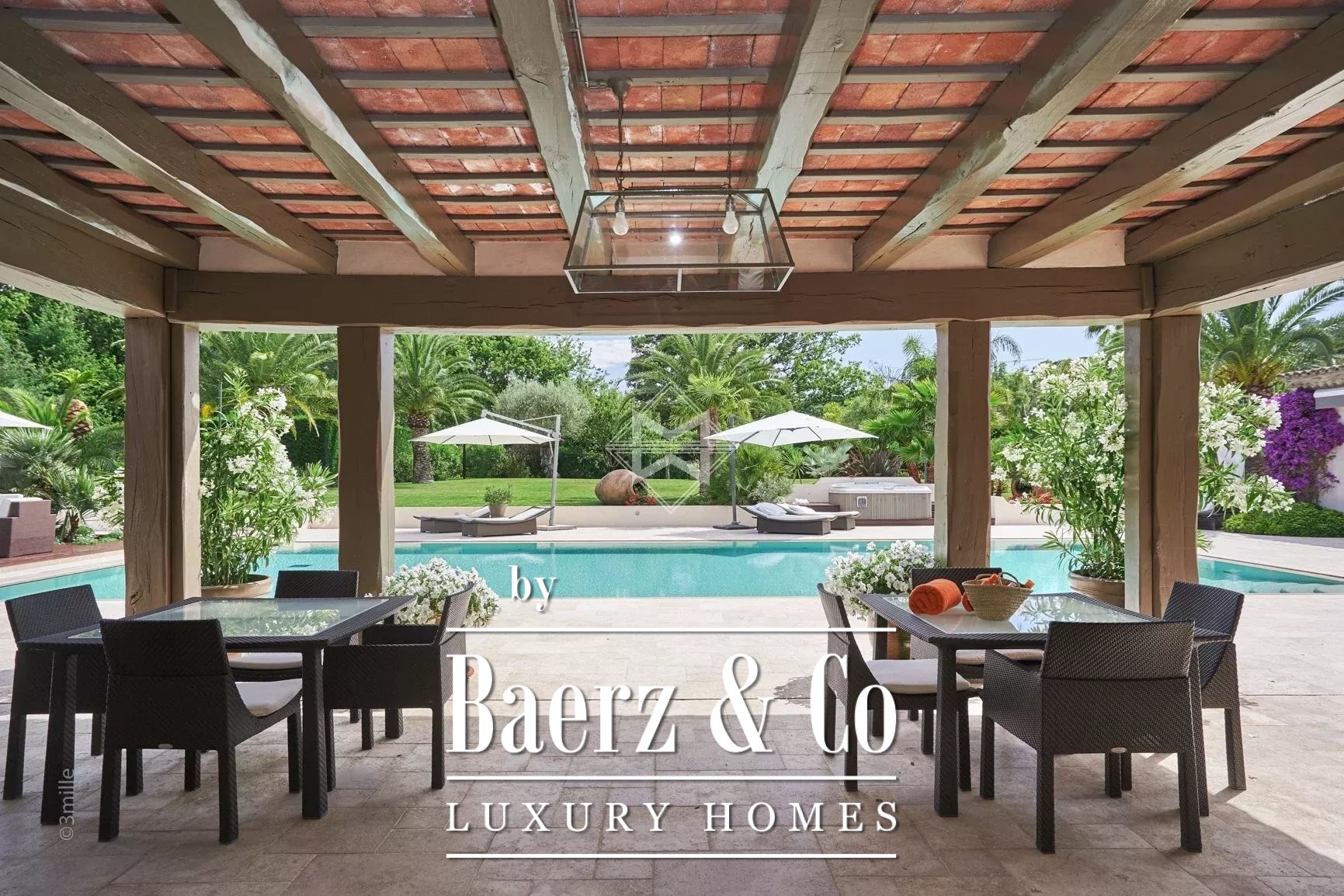 The bastide-style building with two levels is set on 4 400 m² land, enjoying large volumes and high-quality materials.