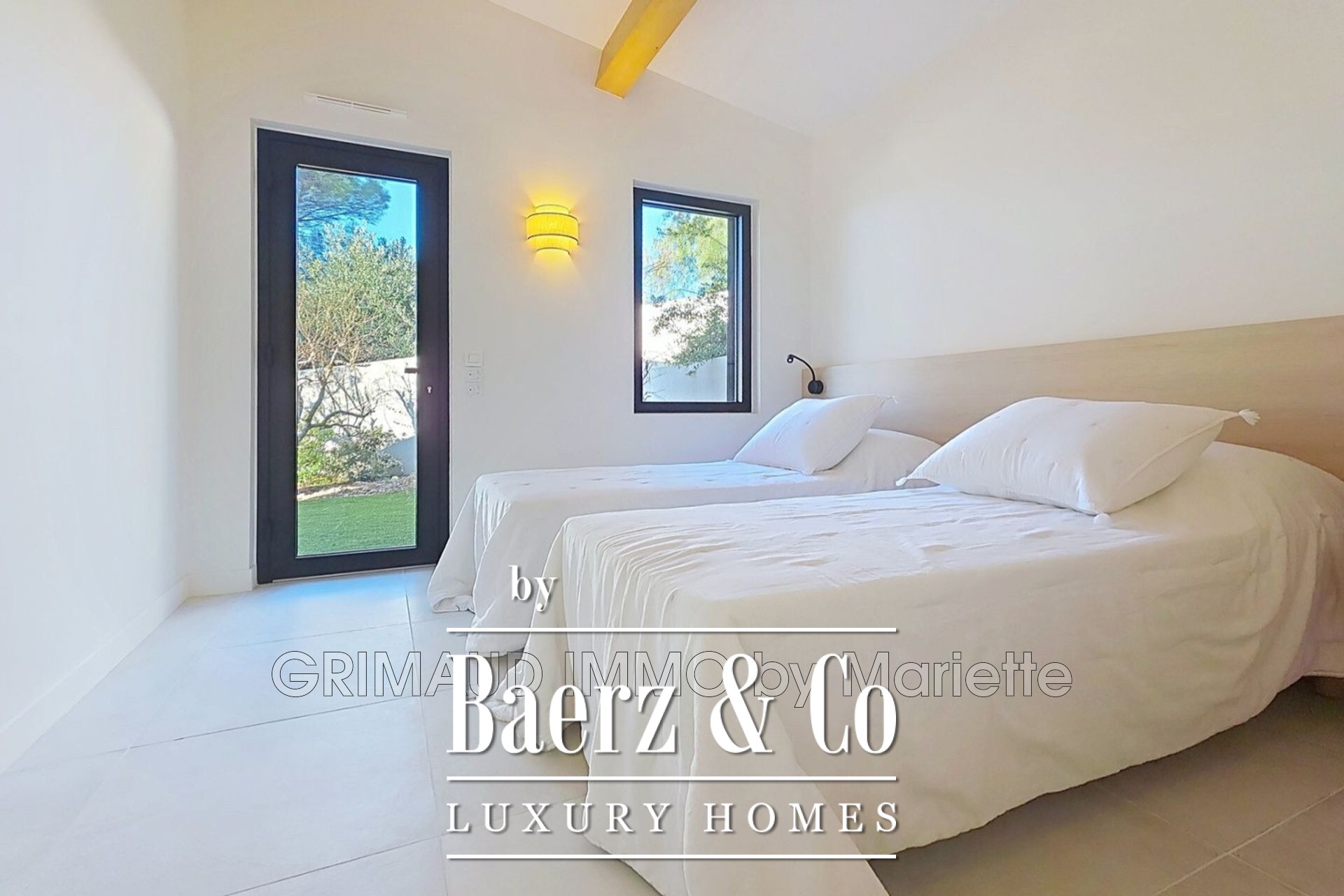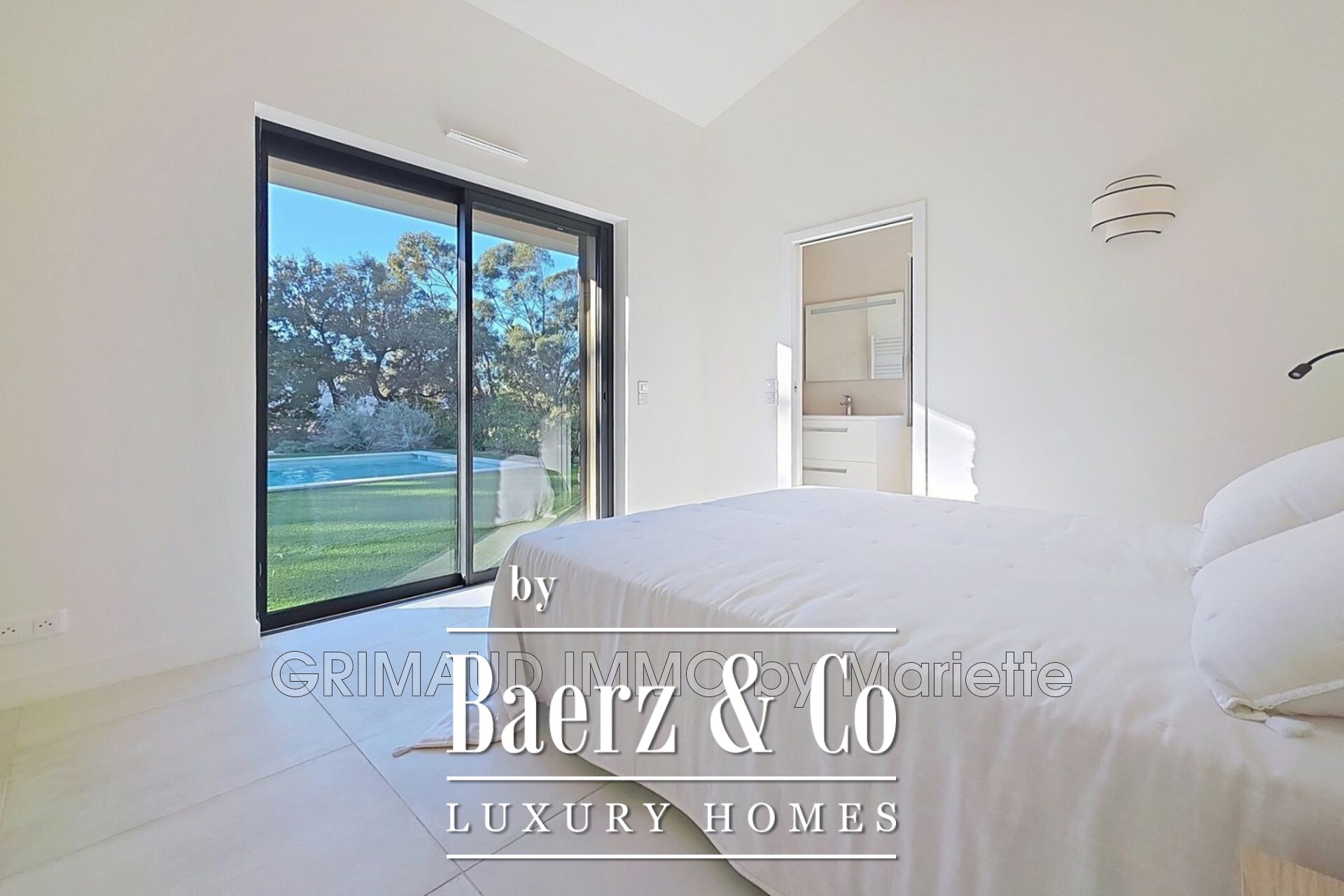 Outdoors, the landscaped garden is curated with Mediterranean plantings, automated irrigation, and night lighting, creating an inviting sanctuary for quiet afternoons or evening gatherings. The 810 m² plot offers two terraces, a central patio, and a sunlit 5 by 10 metre swimming pool. A 28 m² garage and two parking spaces provide convenience within the property’s boundaries. In this luxury villa for sale in Sainte-Maxime, comfort and discreet sophistication are the defining notes.