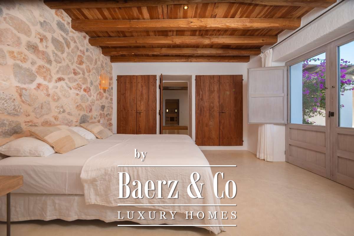 Originally an authentic finca extended in the 1940s, the house now offers 506 m² of living space divided between 361.7 m² on the ground floor and 144.64 m² above. Four bedrooms and five bathrooms have been thoughtfully renovated, each detail respecting the cubic architecture and rustic simplicity. Living areas blend seamlessly with garden terraces, encouraging an unhurried Mediterranean rhythm.
