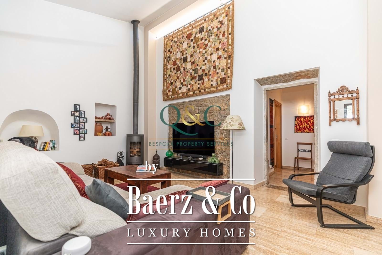 A calcada driveway introduces the estate, leading to a spacious garage and practical utility area that connects to the heart of the home—the equipped kitchen and dining area. The main reception hall welcomes light and garden views, flowing seamlessly to living and entertaining spaces. The principal suite, framed by dual garden aspects, includes an en-suite with a roll-top bath and walk-in shower, establishing a private sanctuary within the home. Each of the four bedrooms features an en-suite bathroom, while a mezzanine level in one creates a retreat for work or leisure, spilling onto a sheltered roof terrace.