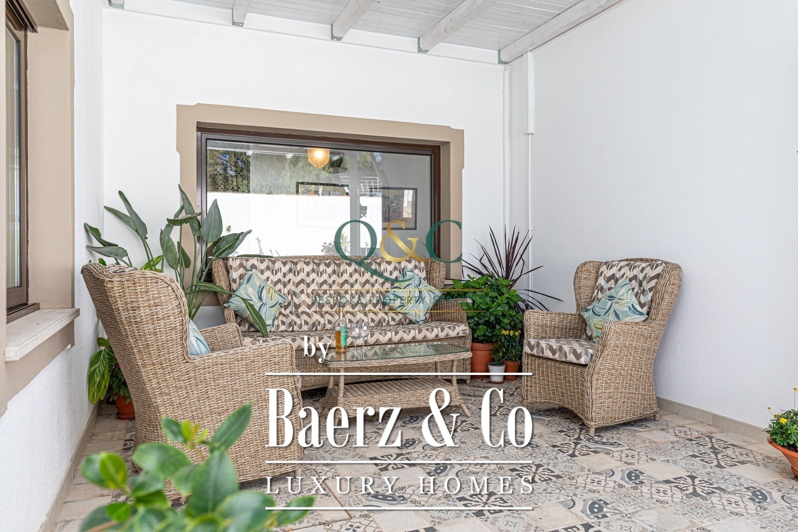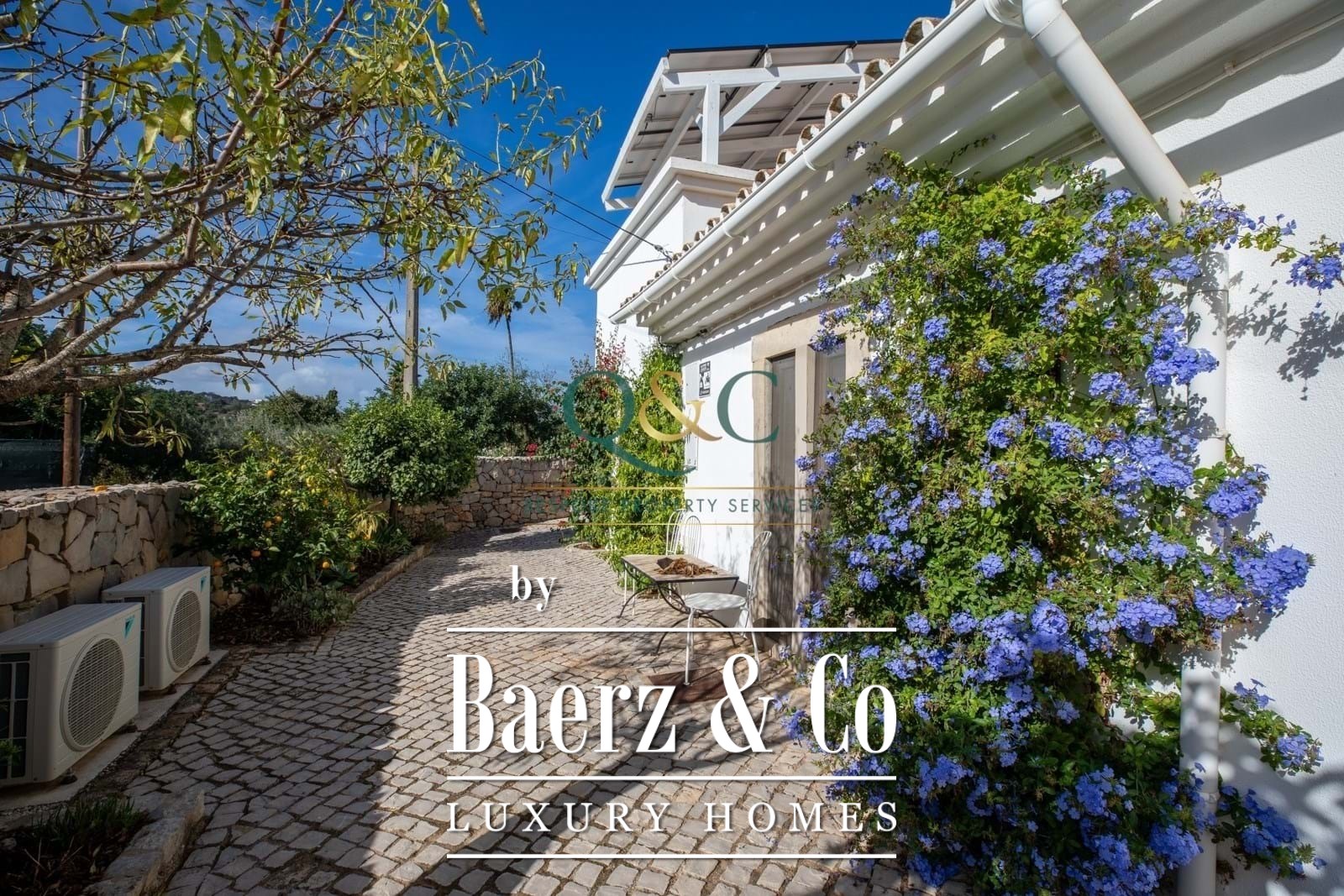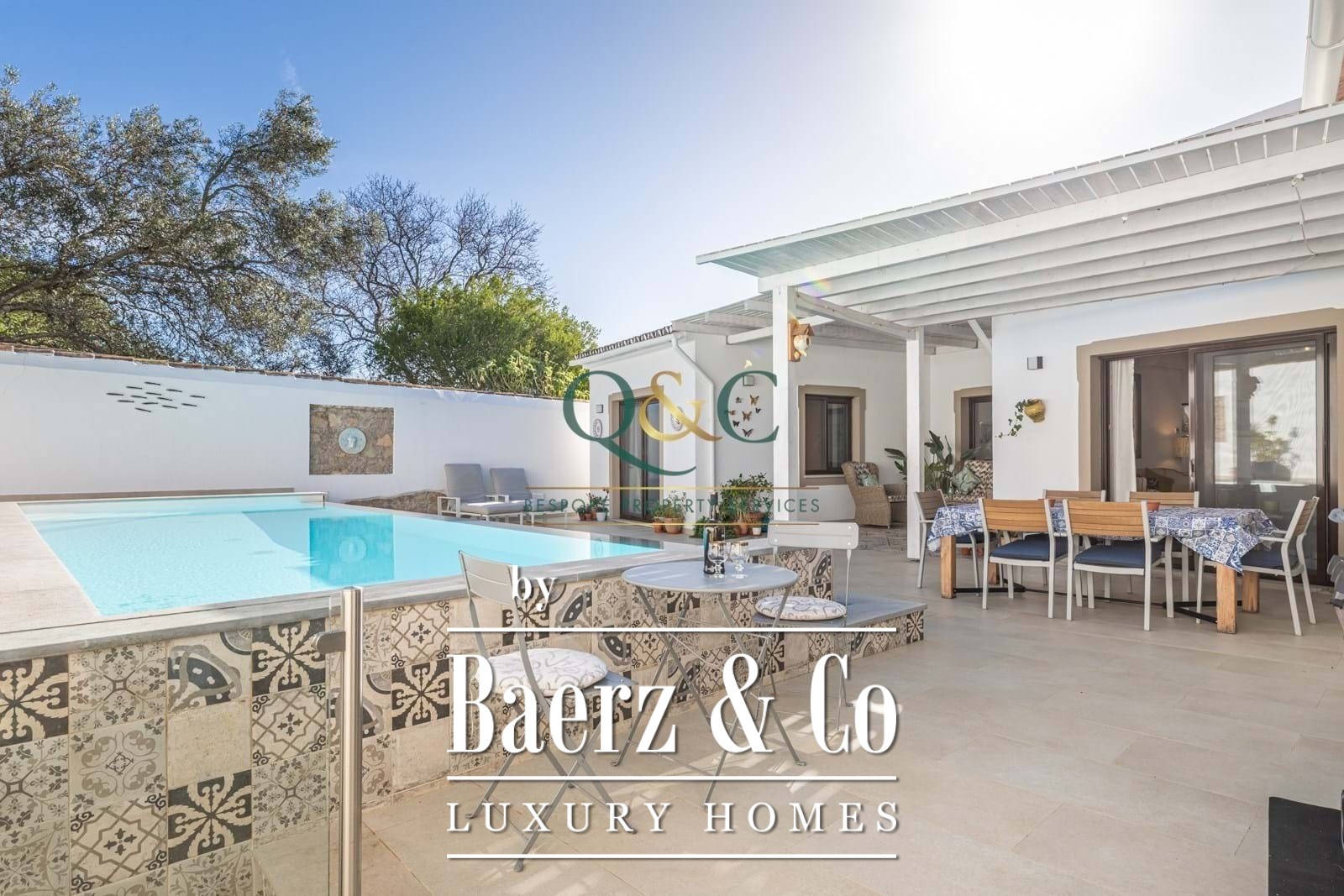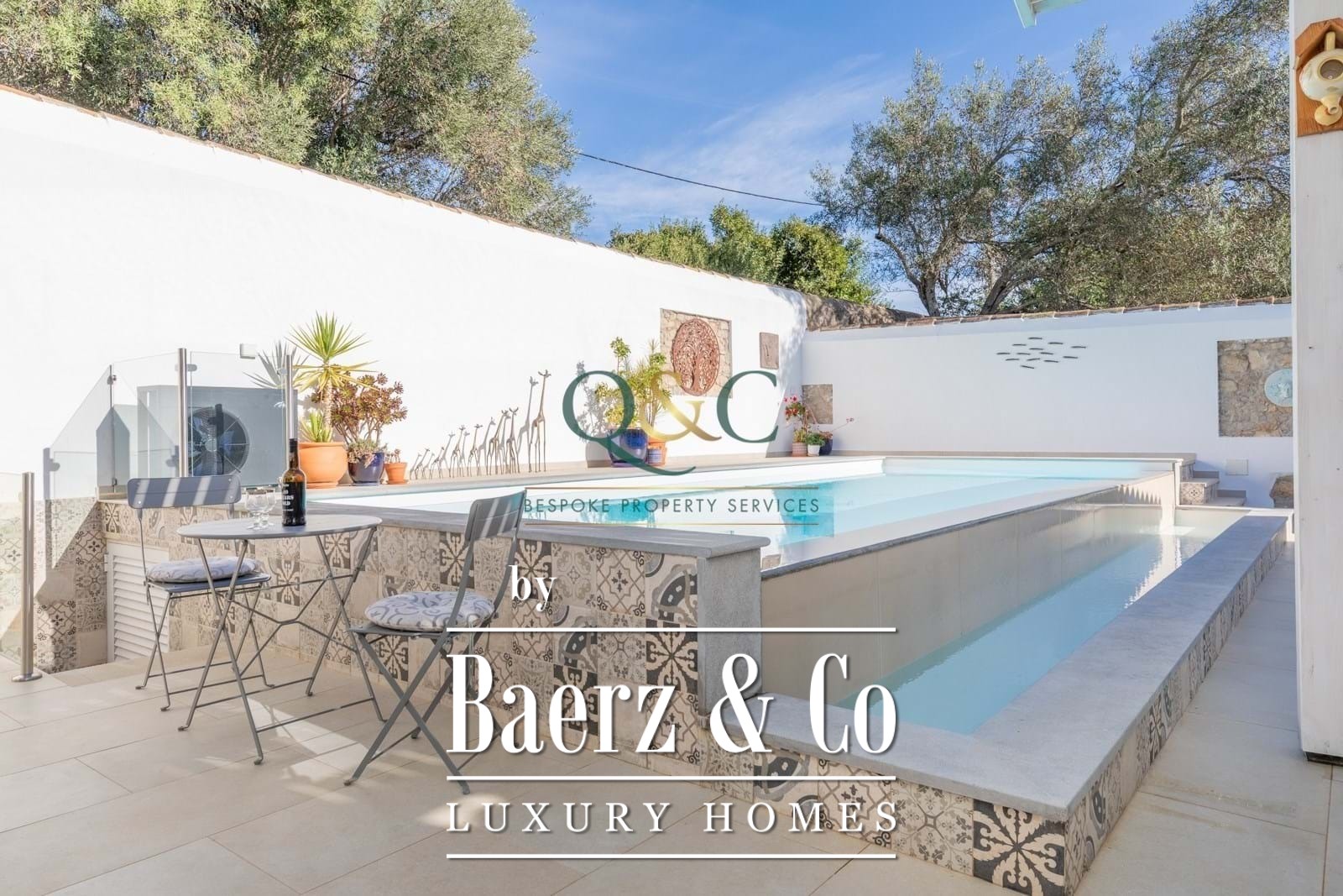 The rear garden is fully walled, providing privacy and a sunlit setting for the 8 x 3 m heated infinity pool and covered alfresco dining areas. Mature, low-maintenance landscaping and calçada stone pathways unify the outdoor experience. Features such as Daikin air conditioning, electric underfloor heating, solar hot water, PV panels generating 6.5 kW with a 12 kW battery system, and mains water enhance comfort and efficiency.