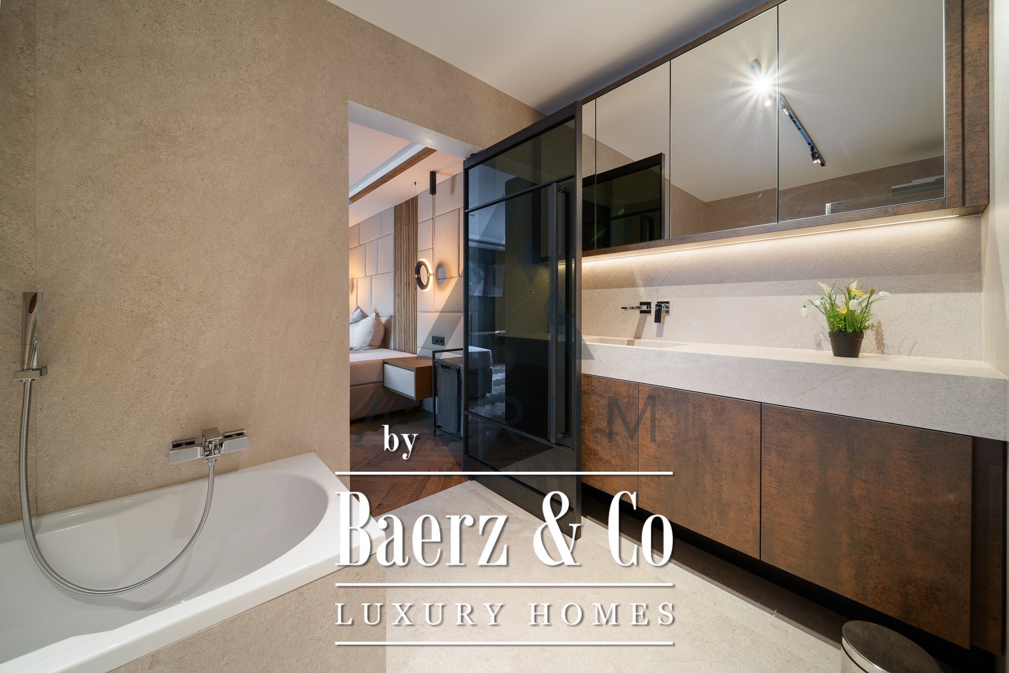 Throughout the interiors, elegant designer furniture, bespoke joinery, and reclaimed timber features reveal a devotion to craftsmanship. The kitchen is fitted with Gaggenau appliances and high-end fixtures, complemented by exclusive hardwood floors and a designer lighting concept. Two distinct apartments within the residence offer complete privacy, each equipped with their own kitchen and bathroom, allowing for flexibility in family living, guest accommodation, or remote work.
