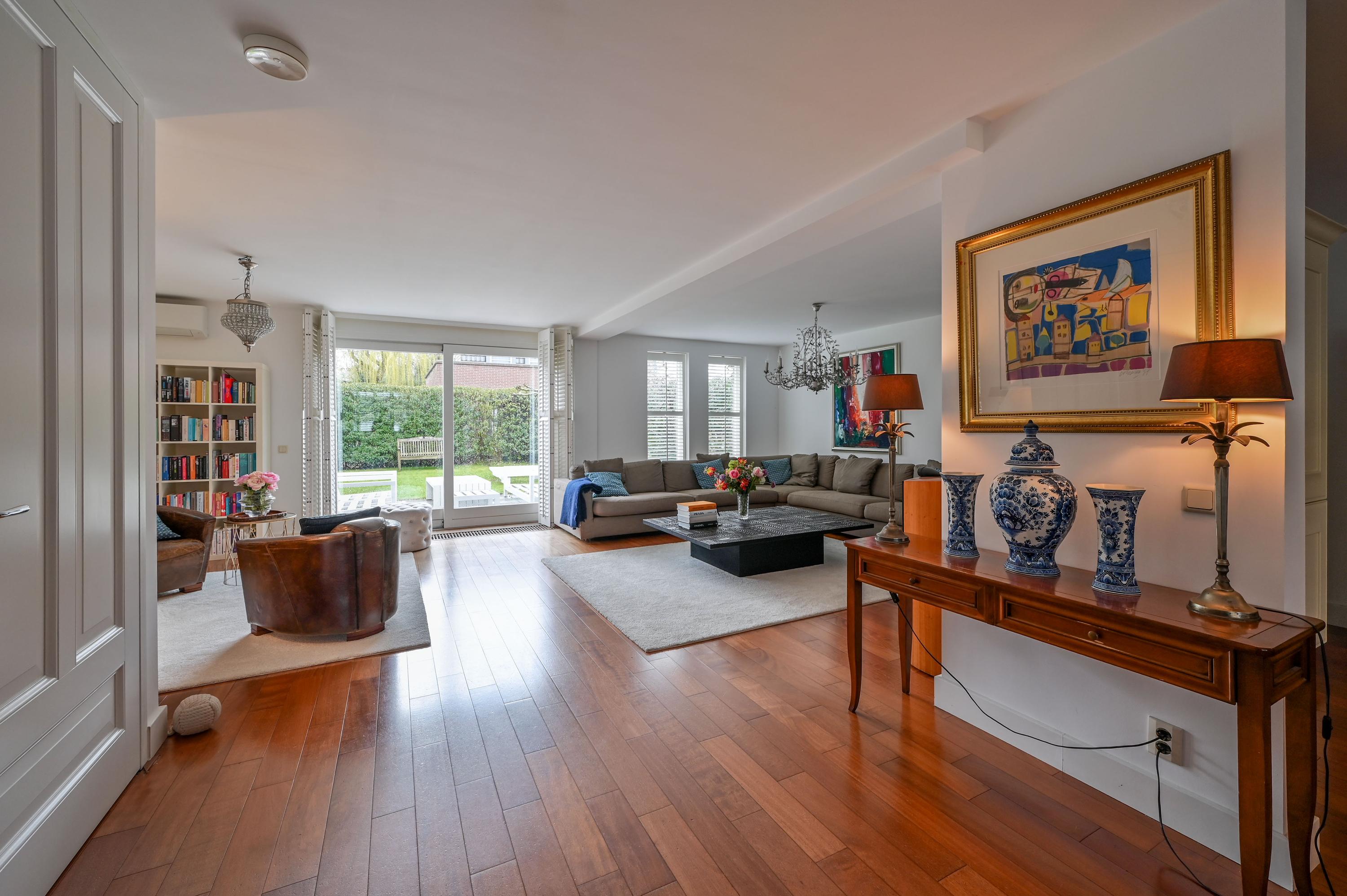 The L-shaped living room at the rear, with a generous seating area, offers beautiful views of the garden and a wide sliding door to the outside. The spacious seating area and a cozy reading corner with a wood-burning stove make it a place to completely unwind. The large side window overlooks the side garden, while shutters, sunscreens, and air conditioning ensure comfort in every season. The entire ground floor is finished with a warm, luxurious wooden floor.
