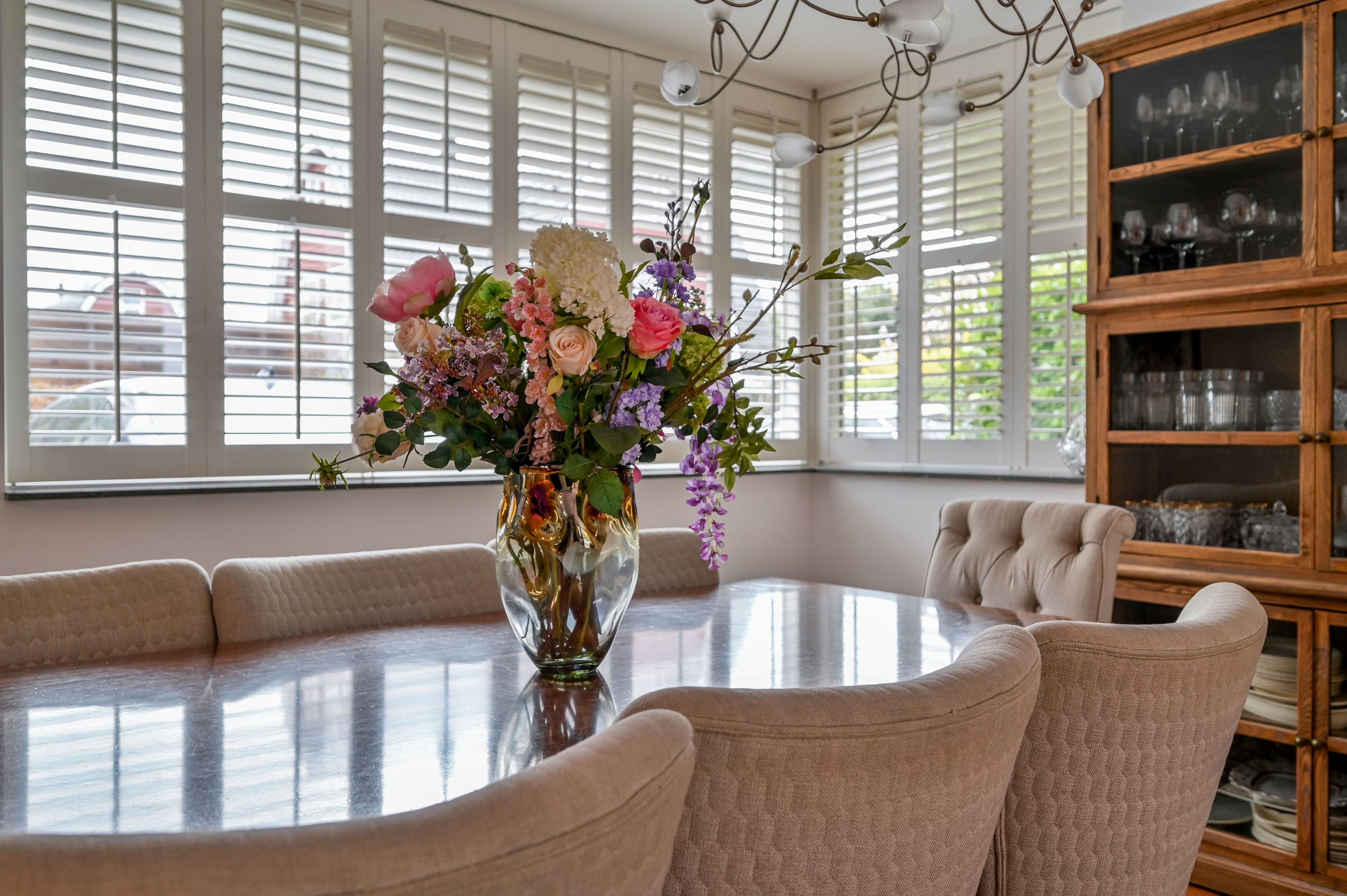 The kitchen at the front is bright and spacious, with large windows and a corner window at the dining area fitted with charming shutters – an ideal spot for cozy meals. The country-style kitchen features a central island with an induction hob and practical drawers on both sides, complemented by an elegant wine rack. The L-shaped countertop provides ample space and is equipped with luxury built-in appliances, including a grill plate, fryer with extractor hood, and built-in food processor. At the window side, there is the sink area with a double sink, Quooker, and dishwasher. A large cabinet wall with a combination microwave, additional oven on the other side of the kitchen, and space for a large double fridge/freezer with ice machine (available for takeover) completes the setup. Under the stairs, there is also a convenient cupboard for coats and extra storage.