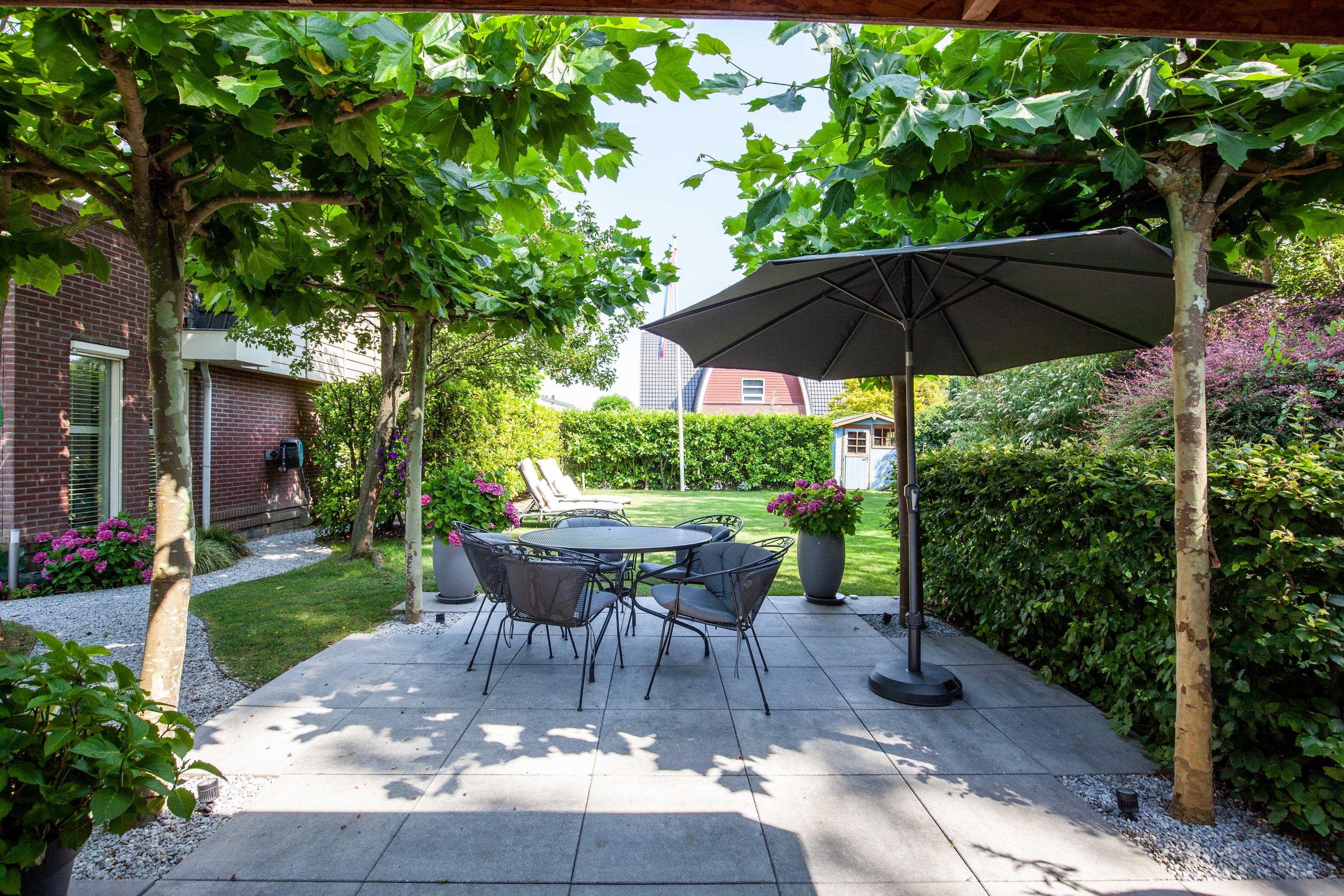 The beautiful garden is a true outdoor paradise, directly accessible via the sliding doors in the living room and via the side of the house through a charming open gate. The garden offers plenty of privacy and enjoys sunlight throughout the day, perfect for enjoying the outdoors. At the rear, there is a spacious terrace with a cozy seating area, complete with an awning spanning the full width of the house, ideal for both sun and shade. At the back of the garden stands a charming garden house with a covered area, perfect for a dining area with barbecue. The garden house features a neat wooden floor, electricity, and water, making it perfect as a workspace, hobby room, or for storage. Adjacent to the covered area is an additional terrace with seating, sheltered by a natural canopy of four beautiful plane trees, creating an idyllic spot to relax or entertain guests.