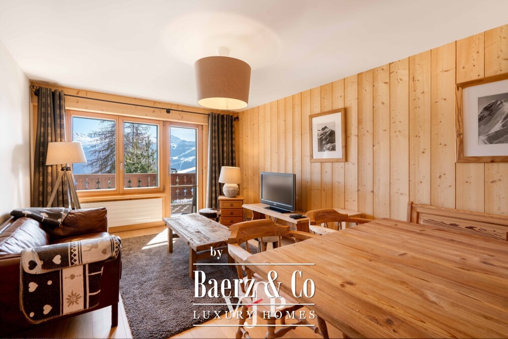 Apartment Verbier with balcony and garage blends thoughtful renovation with a sense of calm at the heart of Verbier. This 64 m² apartment offers an open-plan living room and kitchen pairing light with a welcoming atmosphere. Both the main room and the master bedroom open onto a private balcony, inviting outdoor relaxation and connection to the tranquil surroundings.