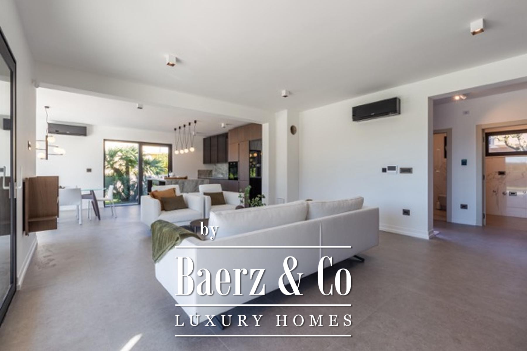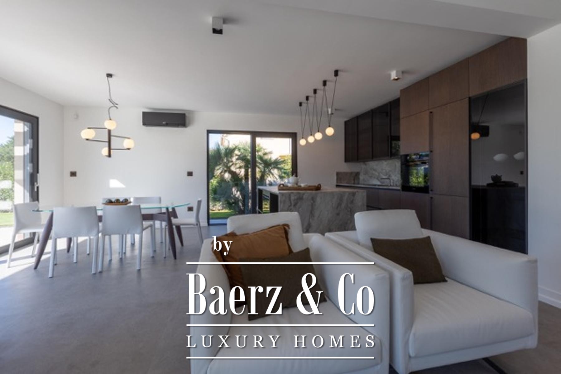 The villa’s technical features echo its emphasis on comfort and efficiency: underfloor heating via a heat pump system, air conditioning, triple-glazed aluminium windows with electric blinds and mosquito nets, a dedicated video surveillance system, and a 13.5 kW rooftop solar power plant ensuring energy self-sufficiency. The outdoor summer kitchen and designer touches invite relaxed gatherings, while a technical room with a water filtration system adds further convenience.