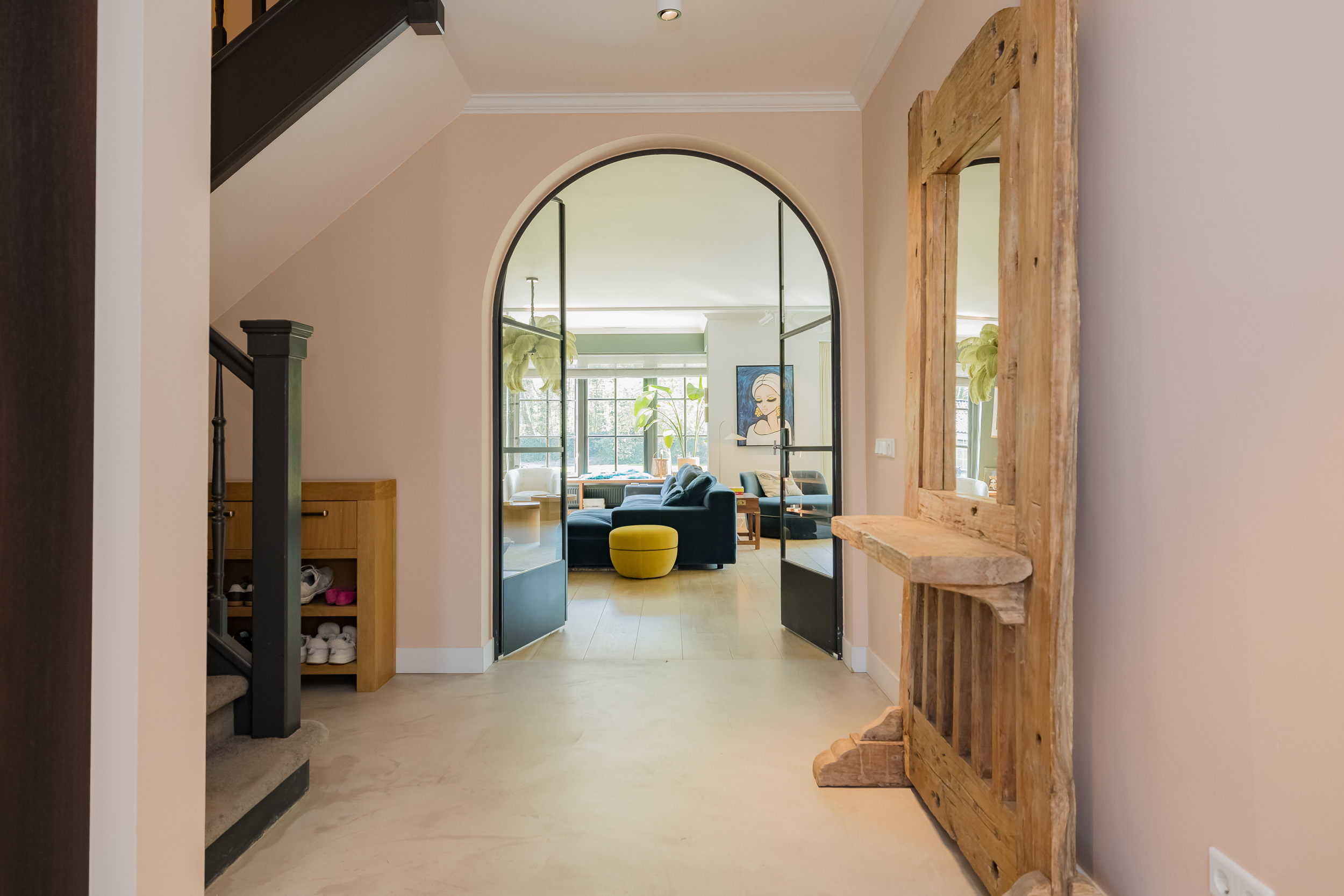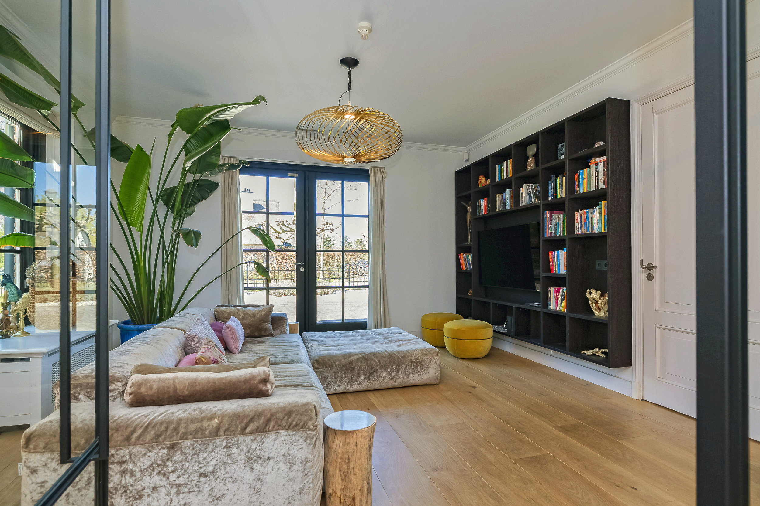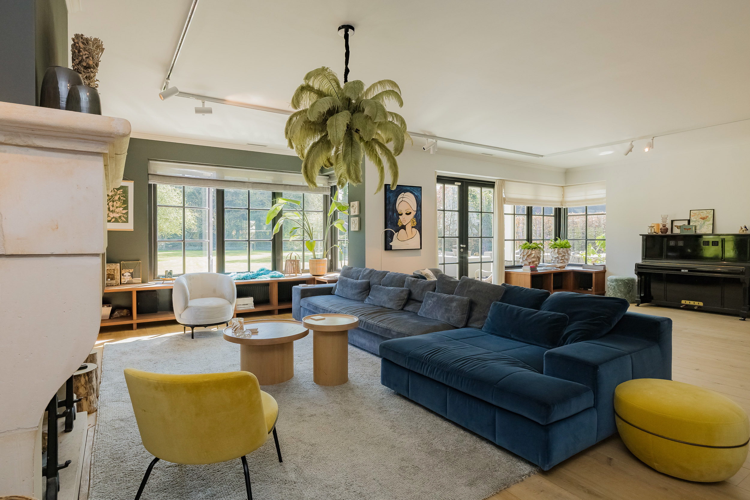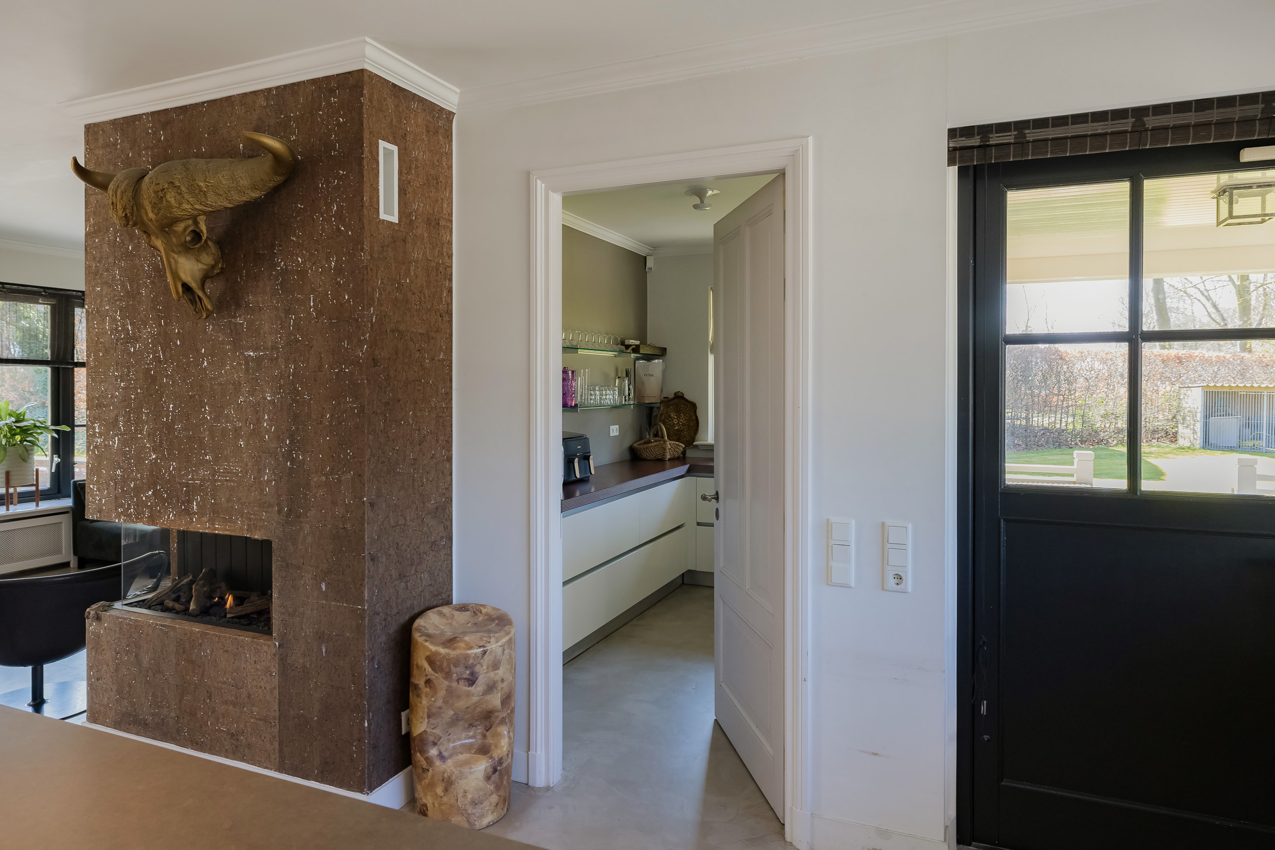 Step into the spacious hall with guest toilet and immediately feel the stylish atmosphere that continues throughout the house. The spacious living room with a beautiful sandstone fireplace and large windows offers a fantastic view of the surrounding garden. For cozy movie nights, there is a separate TV room directly to the right of the entrance. The beautiful concrete-look floor (hallway and living kitchen), luxury steel doors and the high-end kitchen with work island and high-quality appliances provide a modern, yet warm feel. In the living kitchen is further created a lovely sitting area, with access and view of the garden and a modern gas fireplace. Furthermore, on the first floor you will find a practical utility room, double garage, and have access to a spacious porch and a large terrace, where you can fully enjoy the outdoors.