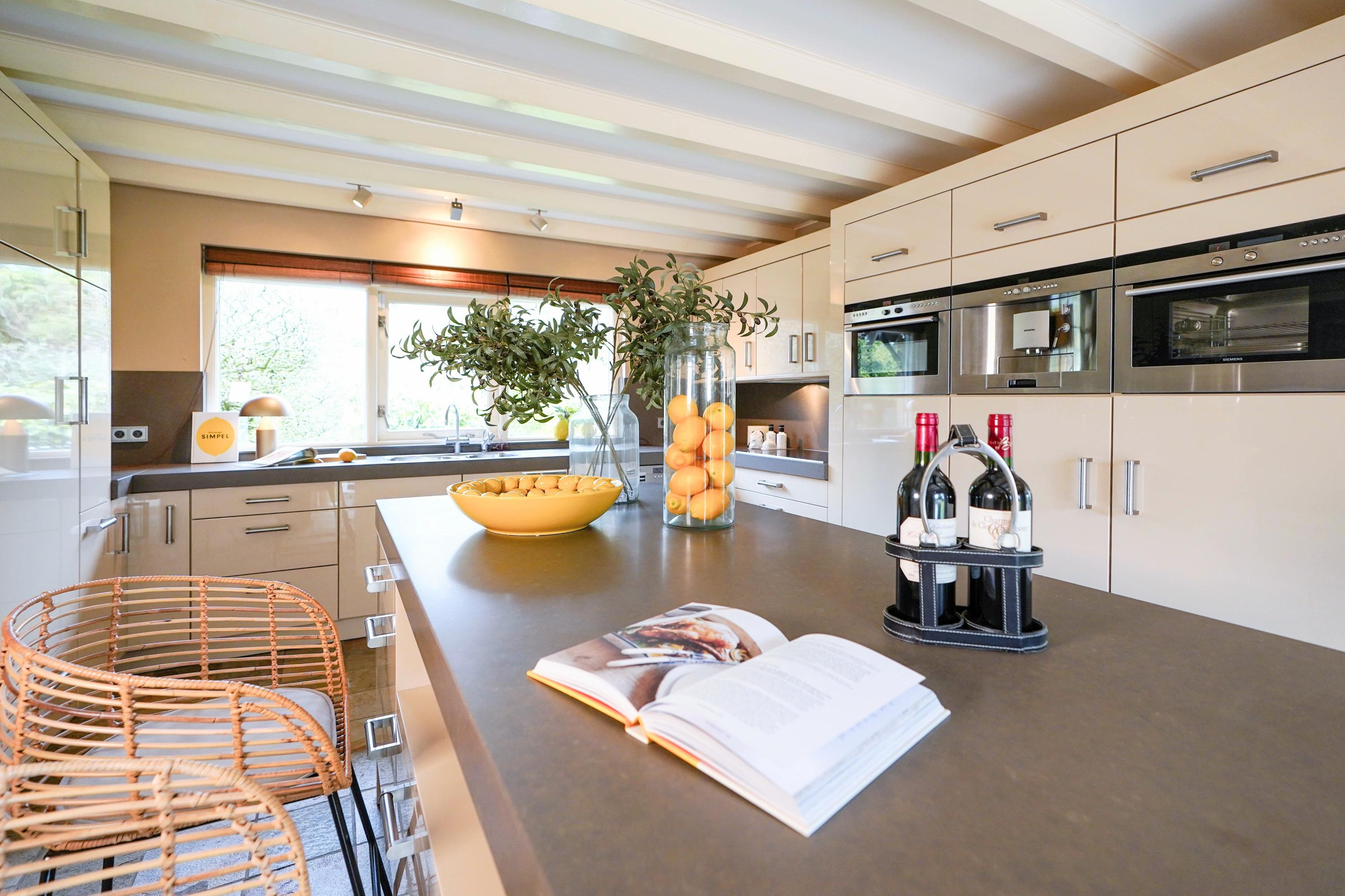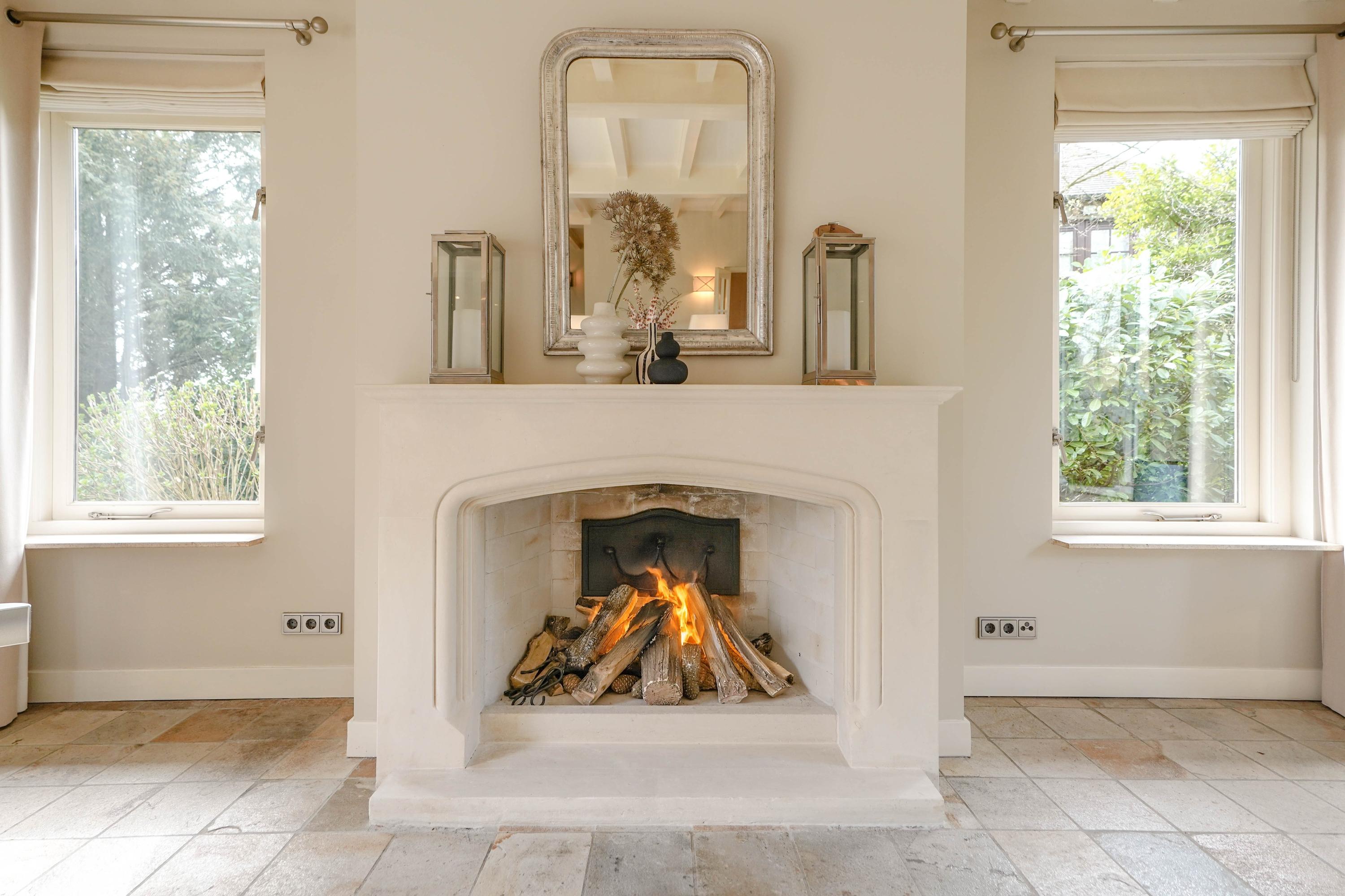 Beyond the formal entrance, the ground floor is arranged for natural light and easy flow, with an elegant living room featuring a sandstone fireplace and direct access to sunlit terraces. A spacious kitchen, utility room, and conservatory—facing the garden, water, and reserve—anchor daily life in a calm rhythm. The ground floor benefits from underfloor heating, and the conservatory is cooled by air conditioning. The villa includes a double garage, several parking spaces, and a certified alarm system.