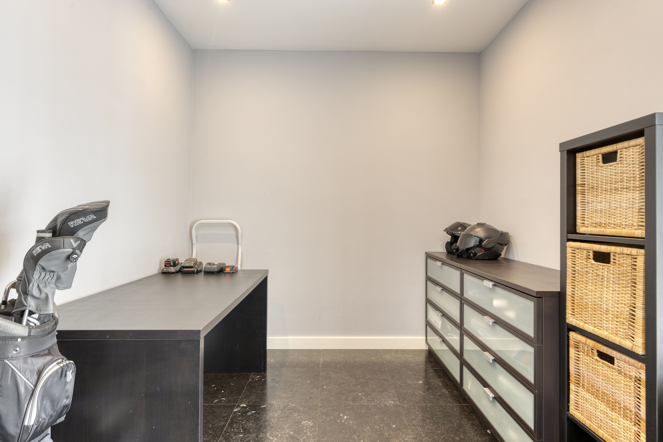 Utility room: washing machine and dryer connections at ergonomic height, practical laundry chute from the bathroom, plastered walls, natural stone floor, ceiling with recessed lighting, door to garden and terrace and door to the multifunctional wing.