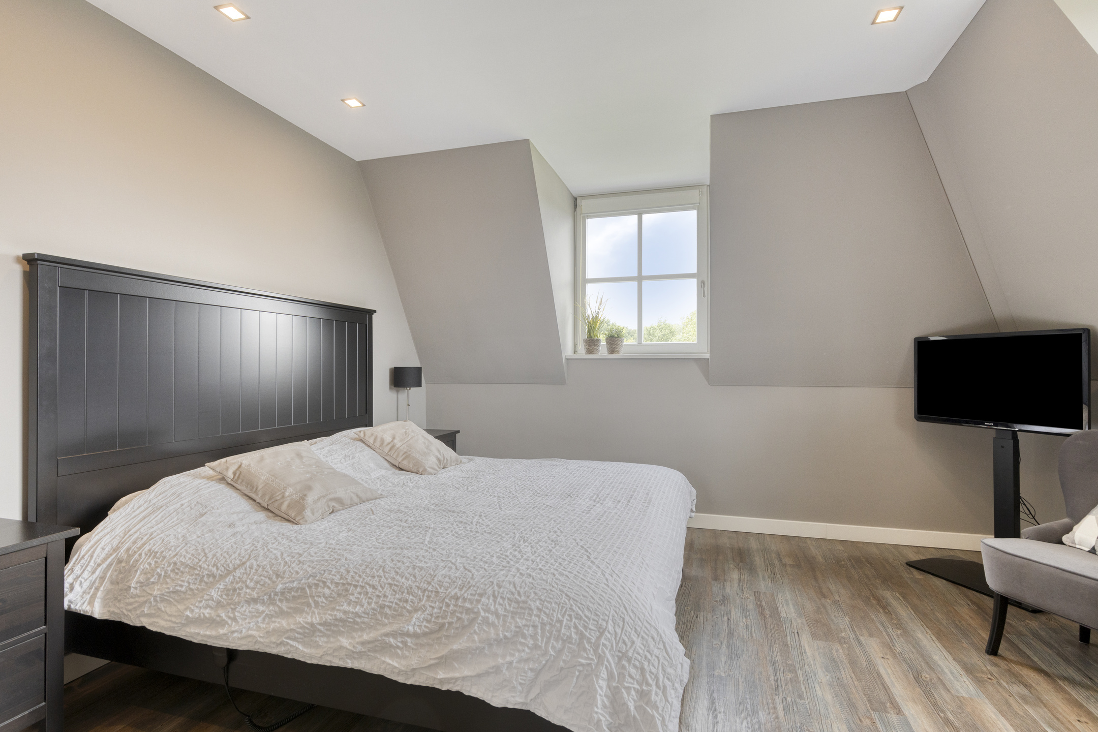 Three additional bedrooms: each with two dormer windows; plastered walls; PVC flooring; ceilings with recessed lighting; from the middle bedroom a loft ladder leads to the second floor.