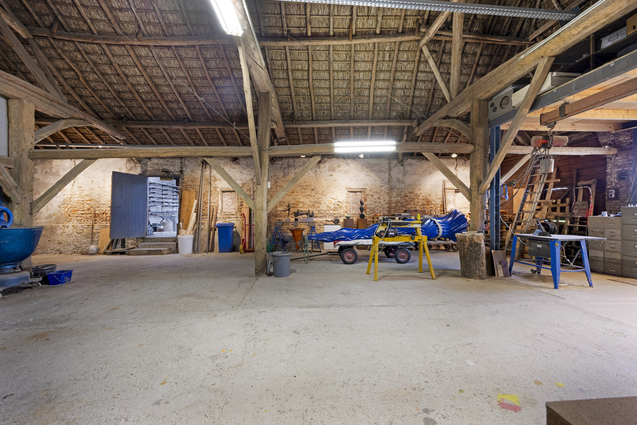 Outdoors, there are two spacious barns of approximately 302 m² and 49 m² respectively. The larger barn still showcases much of its original roof structure, with the full wooden framework visible—an impressively robust and characterful space, ideal for working but also perfect for hosting the occasional celebration.