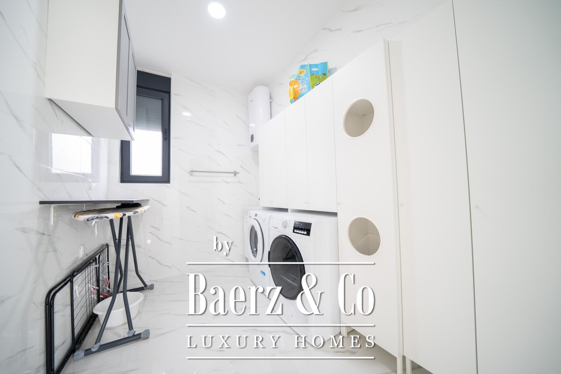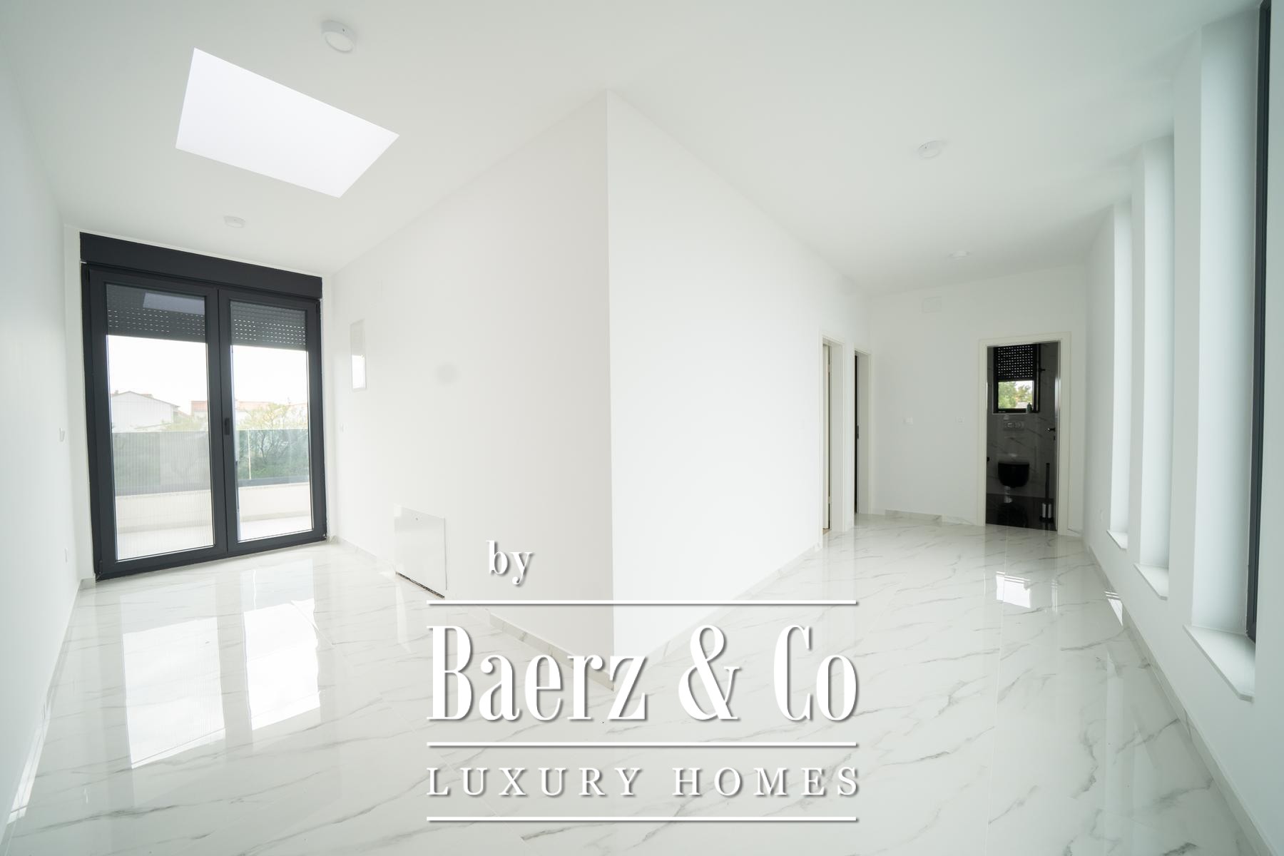 On the ground floor, natural light flows across the expansive living room leading to a terrace, inviting outdoor living. The adjoining kitchen and dining area are designed for both functionality and conviviality. The floor also includes a bathroom, a laundry room, and a dedicated gym space, underscoring the focus on comfort and well-being. Upstairs, three bedrooms and two bathrooms offer restful retreats, each with access to another terrace and panoramic views of Zadar's gentle landscape.